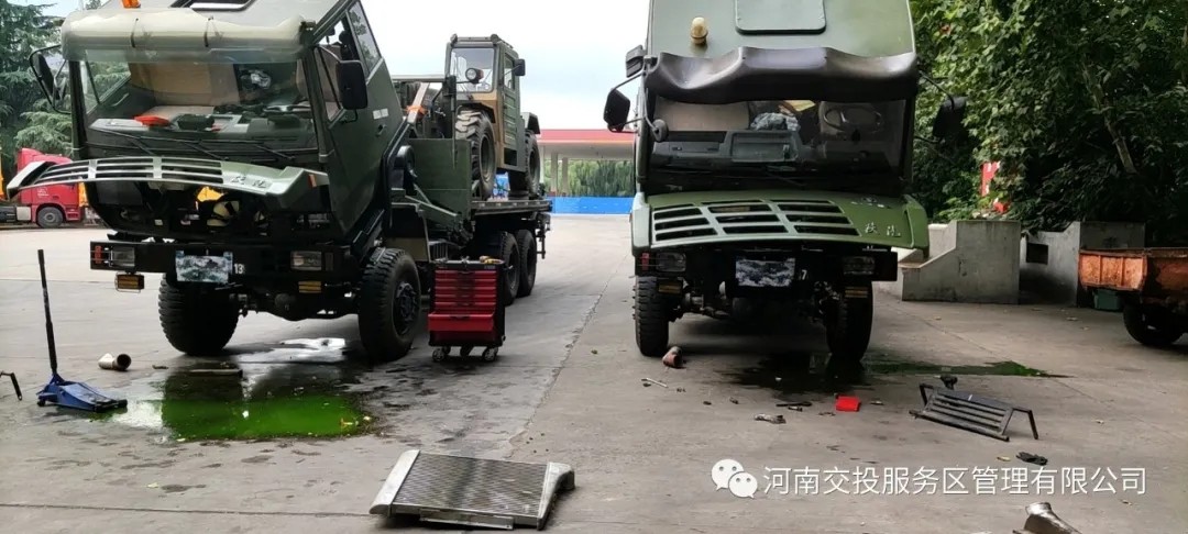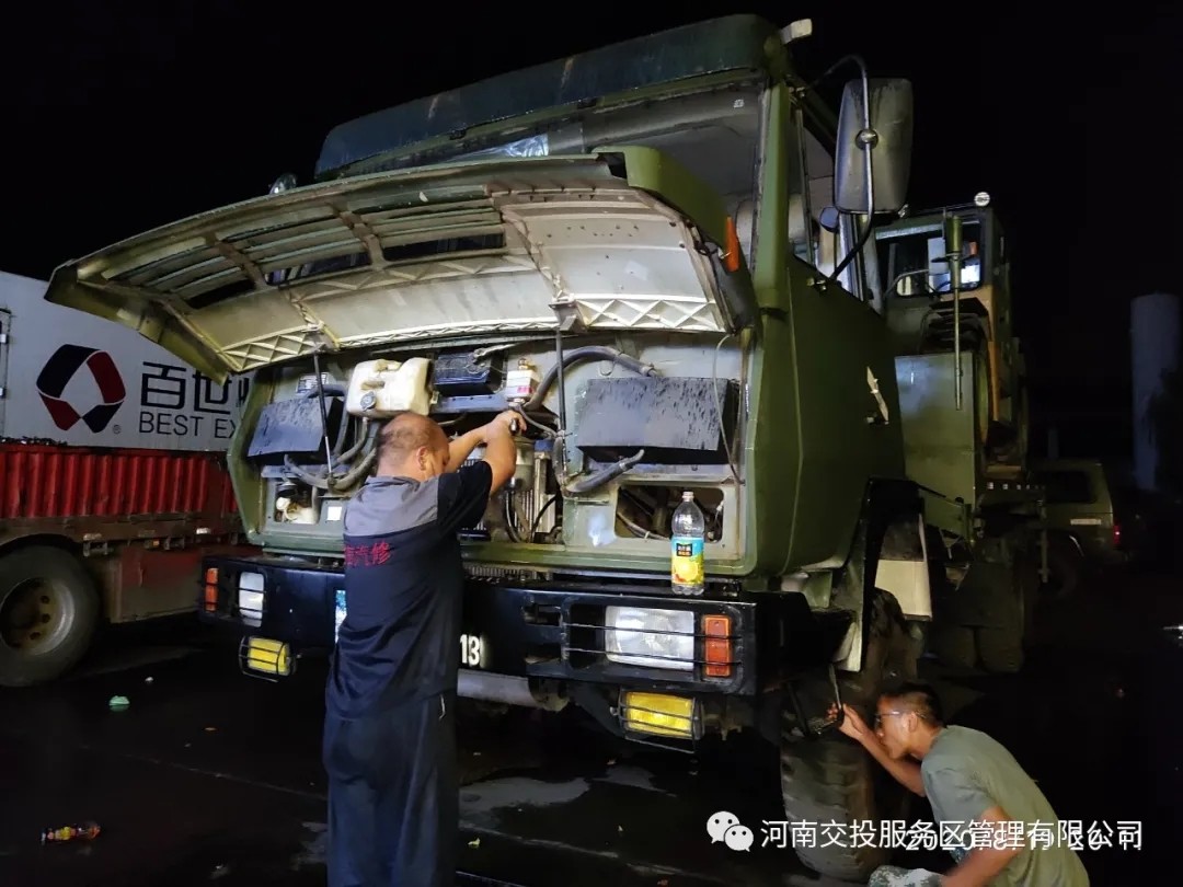 為盡快排除故障、消除隱患,許昌服務區迅速組織人員疏導交通,并立即聯系服務區汽修廠現場進行緊急救援。經排查發現,故障是由于軍車途中遇到積水路面導致風扇斷裂,水箱嚴重損壞所致。出于安全考慮,服務區立即將兩輛軍車拖到安全區域進行搶修。時值酷暑季節,汽修廠維修人員不顧高溫和疲乏,從當晚20:00搶修至次日中午,順利幫助軍車排除了故障,確保了行軍計劃。